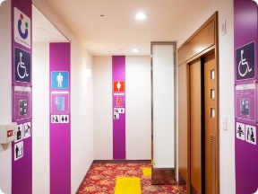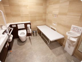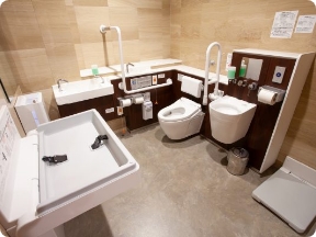 車いす使用者に対応した広いスペースに加え、オストメイト設備、ユニバーサルシートなどを備えた多機能トイレです。どなたでも快適にご利用いただけます。
