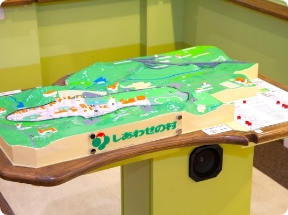 エリアにより色と触感を分けて、見て・触ってわかりやすくなっています。全体イメージをわかりやすくため、村の地形や建物を立体的に表現しています。